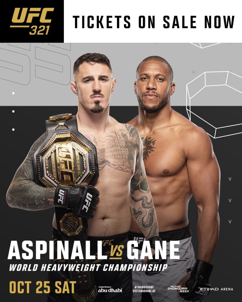 Get ready, fight fans. UFC® 321 lands in Abu Dhabi on Saturday, October 25, bringing with it a blockbuster UFC Heavyweight Championship clash as reigning champion Tom Aspinall takes on top contender Ciryl Gane in a must-see title bout at Etihad Arena, Yas Island.