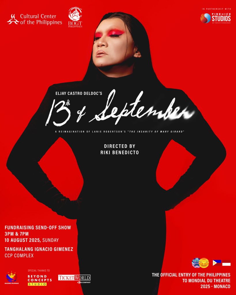 BOGT Philippines, in partnership with the Cultural Center of the Philippines (CCP), will stage a special fundraising send-off performance of its internationally acclaimed production 13th of September on Sunday, August 10, at 3:00 PM and 7:00 PM at Tanghalang Ignacio Gimenez, CCP. This event will raise funds to support the group’s participation in the 18th Mondial du Théâtre in Monaco, happening from August 20 to 27, 2025.