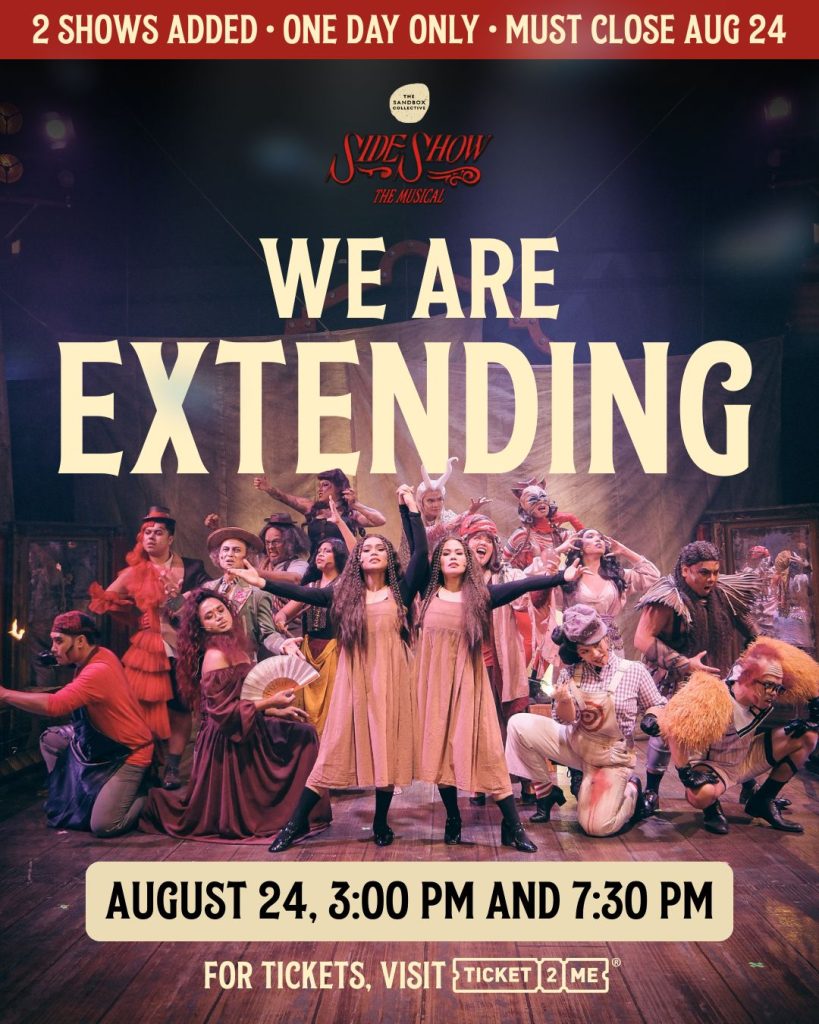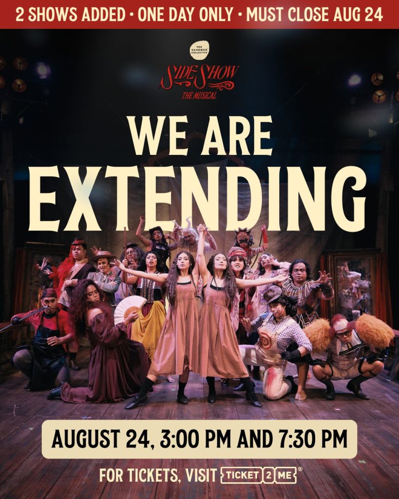 Due to insistent public demand, The Sandbox Collective has just announced Side Show: The Musical’s final extension on August 24, 2025 with two shows – 3:00 PM and 7:30 PM.