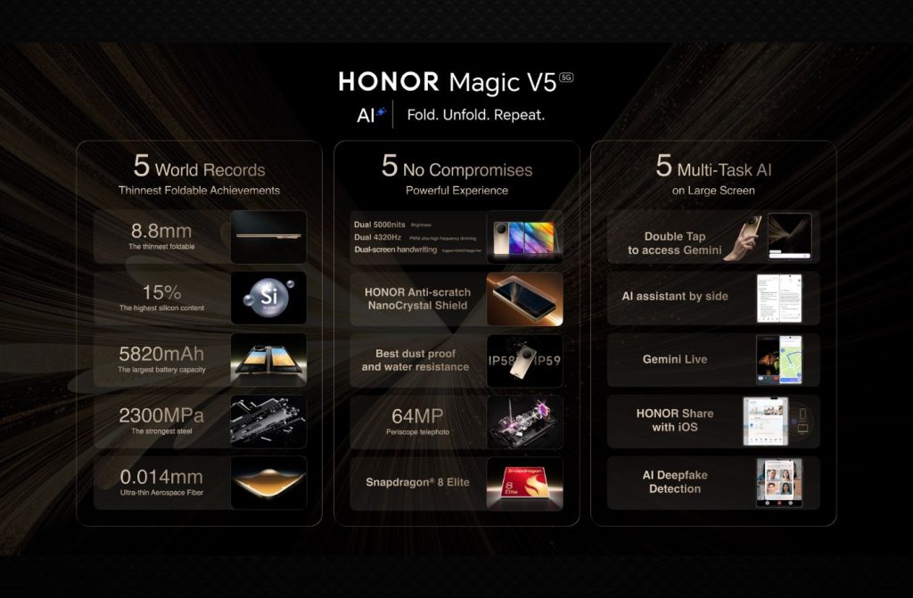 Running on MagicOS 9.0.1 and powered by the Qualcomm Snapdragon 8 Elite 3nm chipset, the HONOR Magic V5 offers ultra-fast performance, AI-driven features, and support for the widest range of 5G bands available on a foldable phone. HONOR’s YOYO AI assistant takes productivity to the next level, helping users complete tasks like creating presentations, booking rides, sharing files, and even coding with simple voice or text commands.