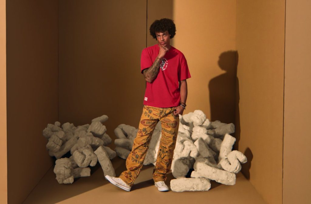 Bottoms include the Western Flare with carpenter-style double knees and custom studs, Loose Jean with patch details, and Carpenter Jean in flour sack print. Each features custom pocket bags with Andy’s handwriting and Saddleman graphics — authentic nods to frontier craftsmanship and Toy Story lore.