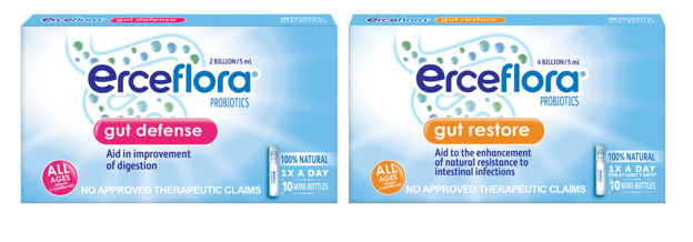 Erceflora Gut Defense helps improve digestion with 2 billion Intelli-spores—especially during routine changes or travel with proper diet and exercise. Erceflora Gut Restore delivers 4 billion Intelli-spores— one mini bottle per day for 7 days from the onset of gut infection symptoms or as directed by a physician with proper diet and exercise.