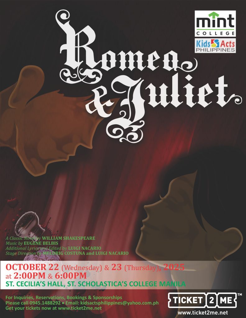 “Romeo and Juliet, The Musical” will run on October 22 (Wednesday) and October 23 (Thursday), 2025, with performances at 2:00 PM and 6:00 PM at St. Cecilia’s Hall, St. Scholastica’s College, Manila. Tickets are priced at Php 1,200 and are available through Ticket2Me at www.ticket2me.net