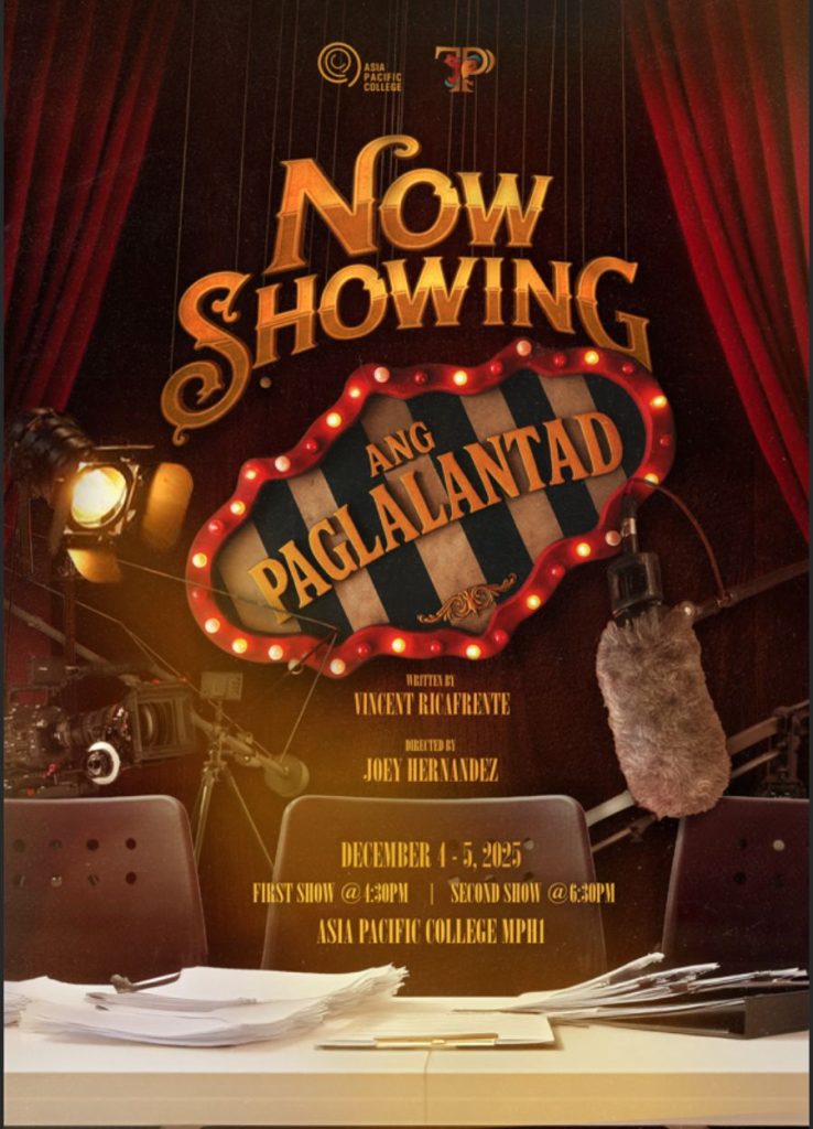 Teatré Phileo announces its latest theatrical offering, Now Showing: Ang Paglalantad, an original work by Vincent Ricafrente. The production will take the stage on December 4 and 5, 2025, with performances at 4:30 PM and 6:30 PM at the Asia Pacific College Multi-Purpose Hall 1. Written by Vincent Ricafrente, the production offers a closer look at the conflicts and compromises behind creating a film, inviting audiences to explore the often unseen realities of cinematic storytelling.