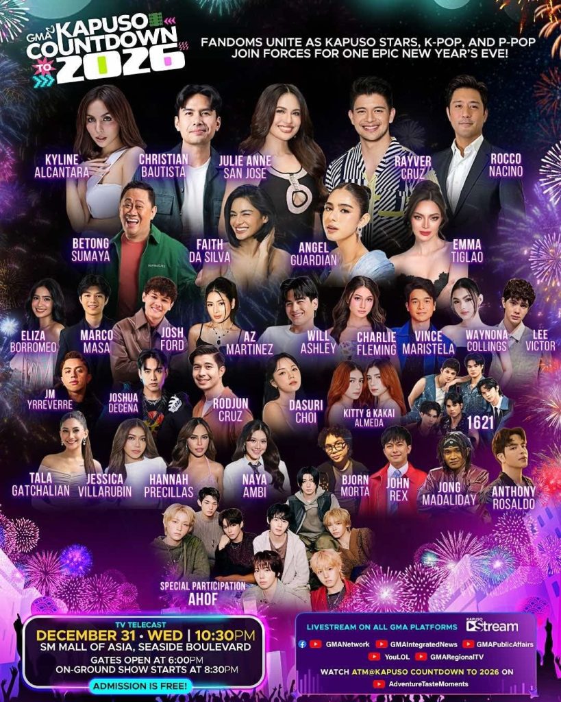 Set against the vibrant backdrop of SM Mall of Asia Seaside Boulevard, the highly anticipated event promises an unforgettable night of music, dance, and celebration featuring some of the brightest Kapuso stars. Leading the countdown are Julie Anne San Jose, Rayver Cruz, Christian Bautista, Rocco Nacino, Betong Sumaya, Angel Guardian, Faith da Silva, and Kyline Alcantara, all ready to usher in 2026 with the Kapuso community.