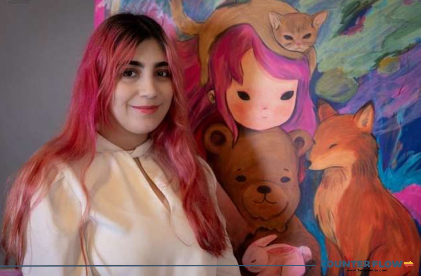 “Each painting builds a world where my inner child and my animals can coexist again, a safe space shaped by healing, imagination, and emotional truth. These works are my homage to them.”